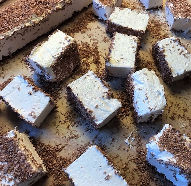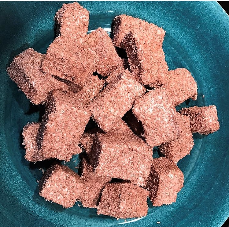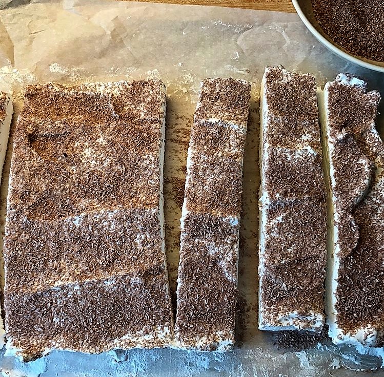 Ställ kallt och låt stelna. Skär sedan upp i bitar och doppa snittytorna i resten av strösslet. Färdigt!