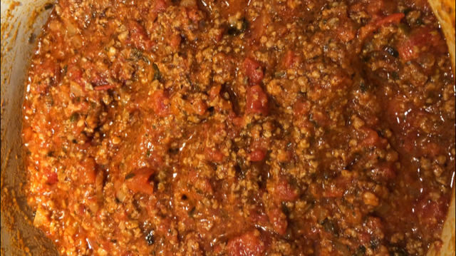 Stek löken mjuk i oljan. Tillsätt köttfärs och kryddor och stek tills köttfärsen delar sig. Tillsätt buljong och krossade tomater och låt sjuda ca 20 minuter. Rör runt då och då.