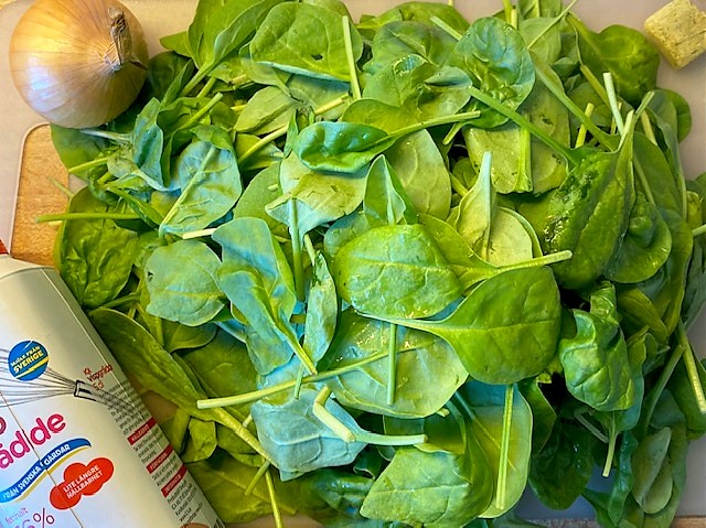 Fräs löken i olja och smör i en stor panna. Tillsätt spenaten och fräs under omrörning tills bladen sjunker ihop.