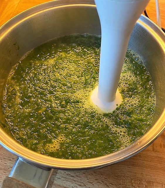 Mixa soppan med stavmixer. Häll på grädde och hetta upp på nytt.