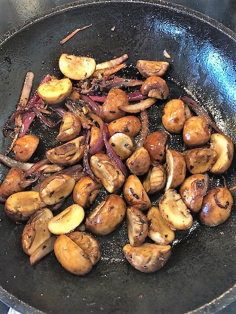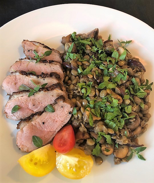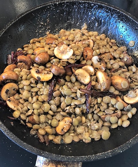 Stek löken i ankfettet som bildades i stekpannan några minuter och tillsätt sen även svampen och fortsätt steka några minuter. Blanda ihop med linserna och strö på hackad persilja.