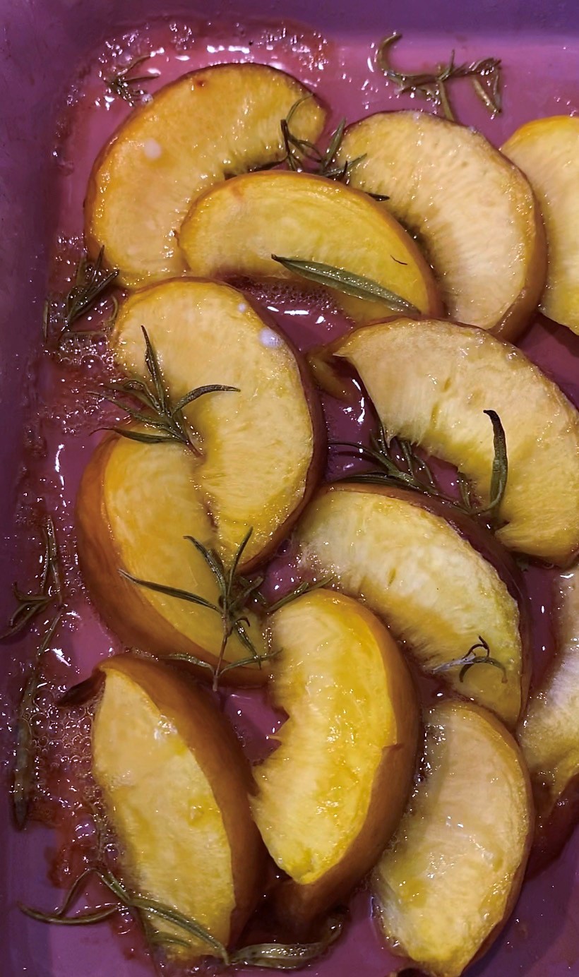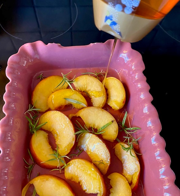 Värm ugnen på 175 grader. Tvätta och skär persikan i klyftor. Lägg i en ugnssäker form och sprinkla på olja och honung. Hur mycket honung du behöver beror på hur pass mogen och söt persikan är. Lägg på det mesta av rosmarinen, men spara några blad till garnering, och tillaga mitt i ugnen tills persikorna mjuknar. Avsluta gärna någon minut under grillelementet för att få fin färg på dem.