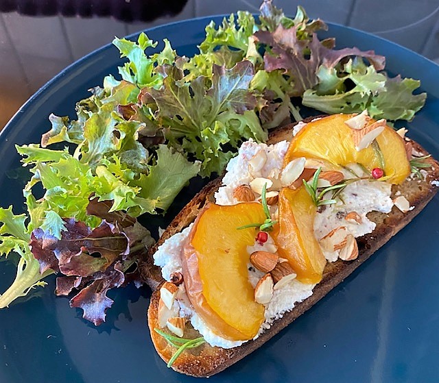 Smörstekt surdegsbröd, kryddig ricottaost och ugnsbakade persikor med rosmarin.