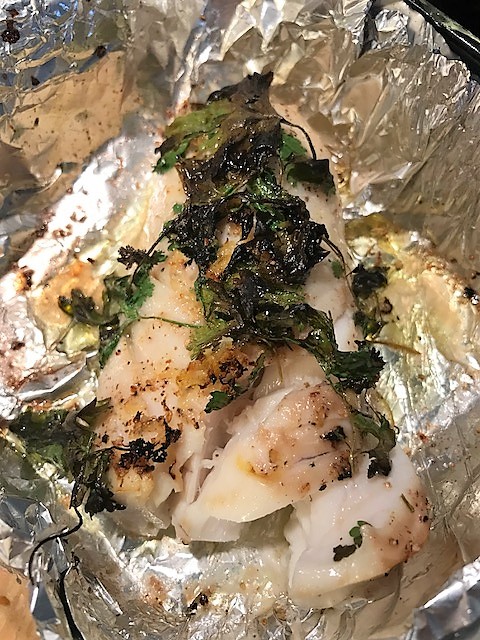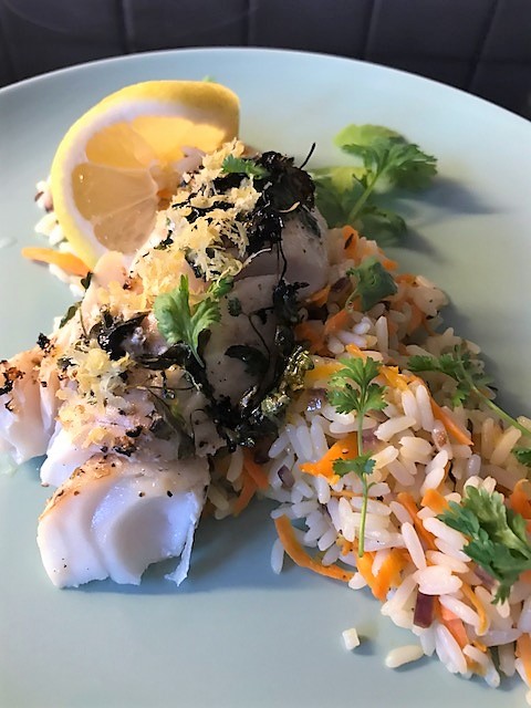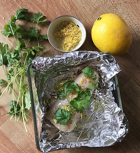 Hetta upp ugnen på grill, ca 200 grader och klä en ugnsfast form med dubbelvikt folie (för att samla upp den goda juicen som bildas). Stryk lite olja i botten och lägg i fisken. Salta, peppra, häll på citronjuice, zest samt det mesta av koriandern. Sätt in i ugnen ca 10-15 minuter tills fisken lätt delar sig utan att vara torr.