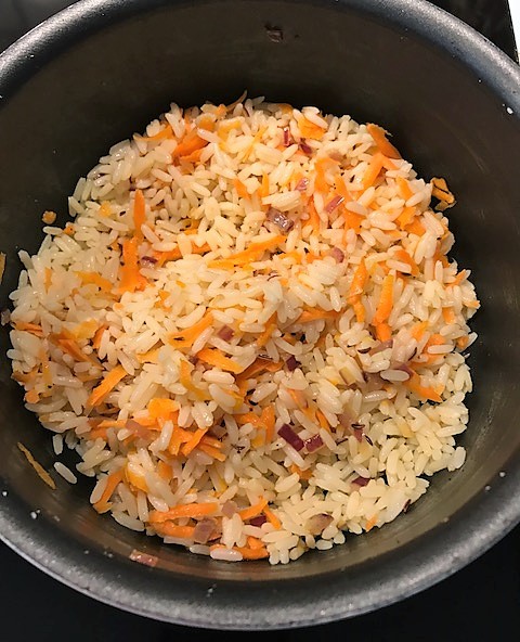 Under tiden tillagar du riset. Häll resterande olja i en kastrull och stek kumminfrö och lök några minuter. Tillsätt morötter och ris. Rör om ordentligt och tillsätt vatten. Täck med lock och låt puttra ca 10 minuter tills riset är klart och vätskan försvunnit. Fördela ris och fisk på tallrikar och häll över vätskan som samlats i formen. Servera ev. med en god sallad.