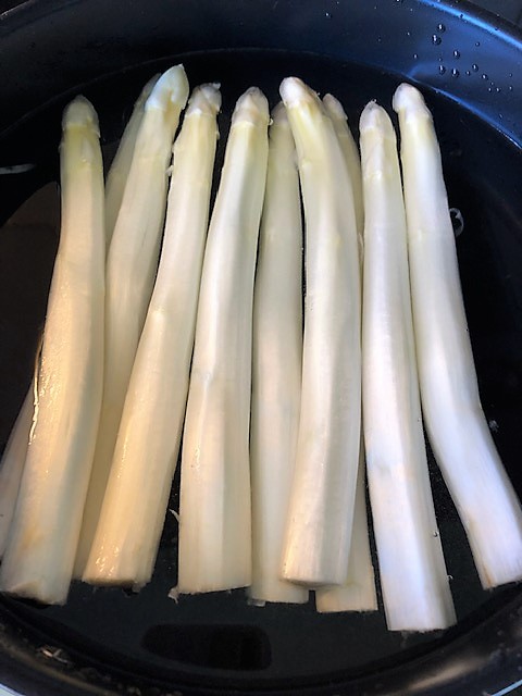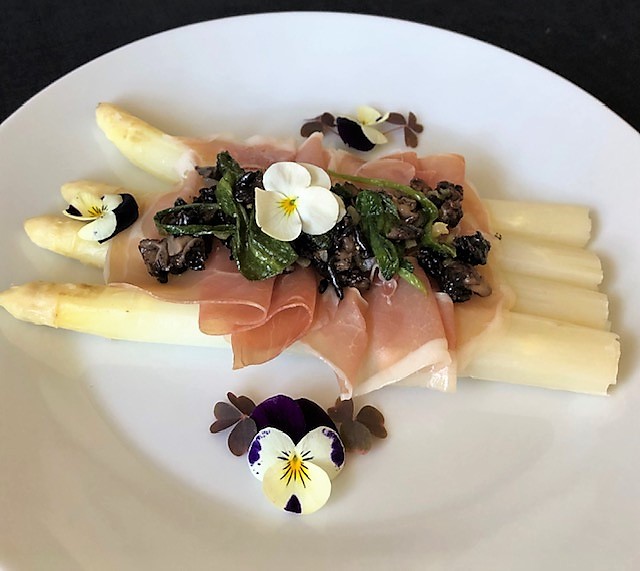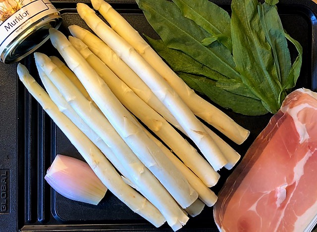 Kokt vit sparris serverad med parmaskinka och toppad med smörstekta murklor med ramslök. En god och ganska matig förrätt som helst avnjuts med ett vitt muskatvin från Alsace eller en riesling från Pfalz.