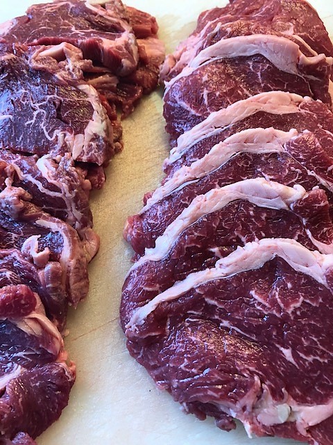Halvtina entrecoten och skär den i mycket tunna skivor.