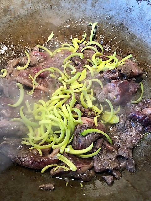 Hetta upp oljan i en wok eller stekpanna och stek köttet på ganska hög värme några minuter tills det mesta av marinaden kokat in. Tillsätt purjolök och blanda runt ordentligt. Strö på sesamfrö och servera med kokt ris och sallad.