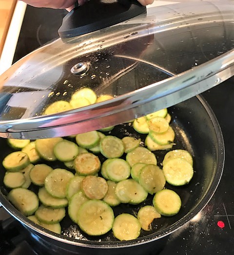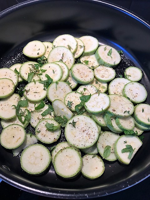 Värm ugnen till 200 grader. Hetta upp oljan i en panna, med lock, och stek zucchini tillsammans med örter, salt och peppar. Lägg på locket och låt steka sakta i ca 10 minuter, rör om då och då, tills zucchinin är mjuk men fortfarande har tuggmotstånd. Lägg sen över i en ugnsfast form.