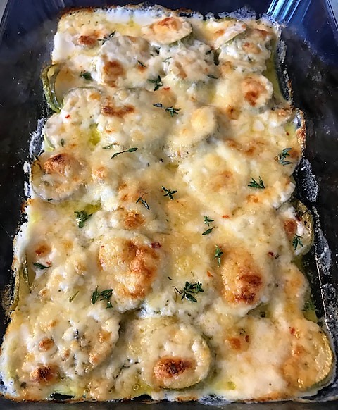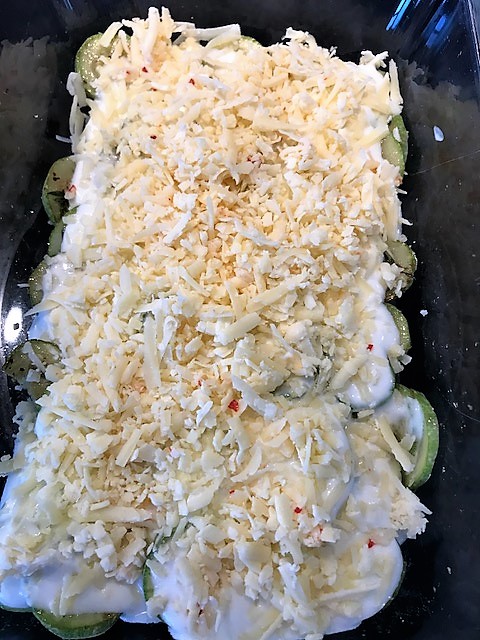Blanda crème fraiche med mjölk, vetemjöl och lite salt och peppar. Häll över zucchinin. Allt kommer inte bli täckt men det gör ingenting. Fördela osten ovanpå och sätt in i ugnen ca 25 minuter tills gratängen fått fin färg och zucchinin känns mjuk.